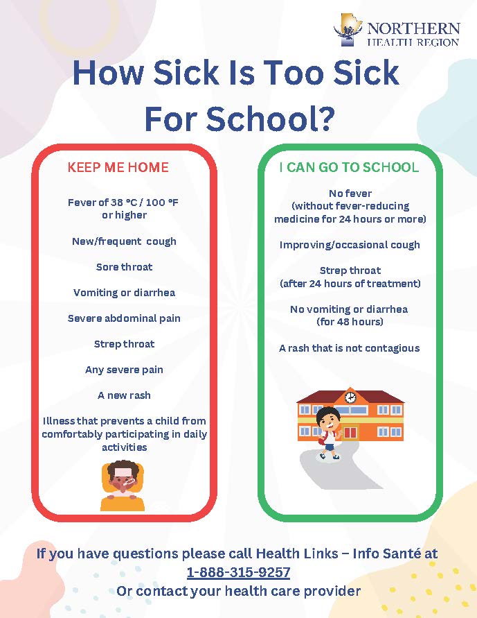 The School District of Mystery Lake is sharing a helpful new resource for families: the “How Sick is Too Sick for School” chart, developed by the Northern Health Region. The guide provides clear direction on when children should stay home and when they are healthy enough to return to class.