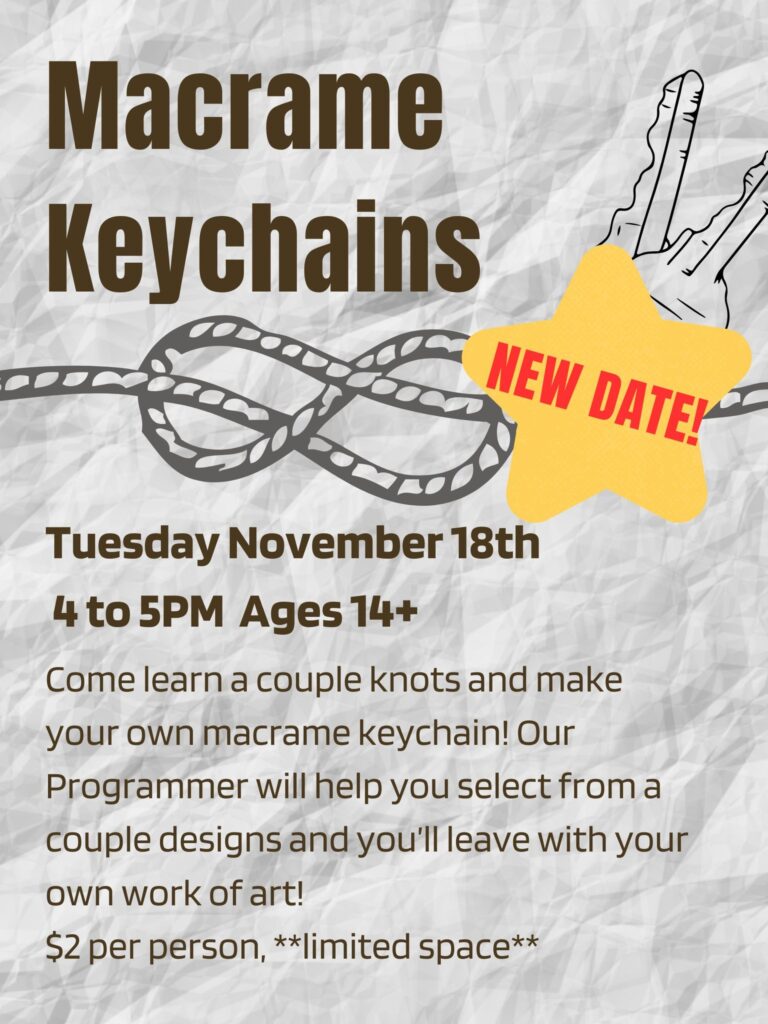 A Macrame Keychains workshop is scheduled for Tuesday, November 18th, 2025, from 4 p.m. to 5 p.m. The session is open to ages 14 and older at a cost of $2 per person. Participants will learn basic knots and complete a keychain to take home. The library notes that some spaces are still available.