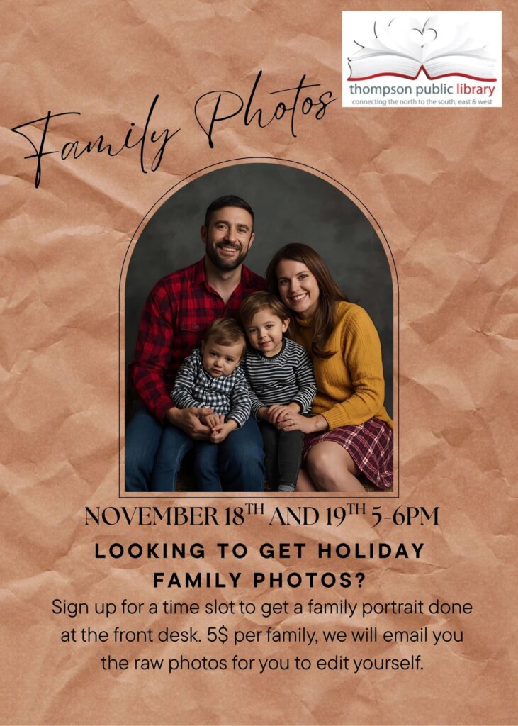 The library will also host Holiday Photoshoots on Tuesday, November 18th from 5 p.m. to 6 p.m. and Wednesday, November 19th, 2025, from 5 p.m. to 6 p.m. Families can have their photo taken in front of a winter backdrop, with digital copies emailed afterward. Each group session costs $5, and payment must be made at the front desk to reserve a time slot.