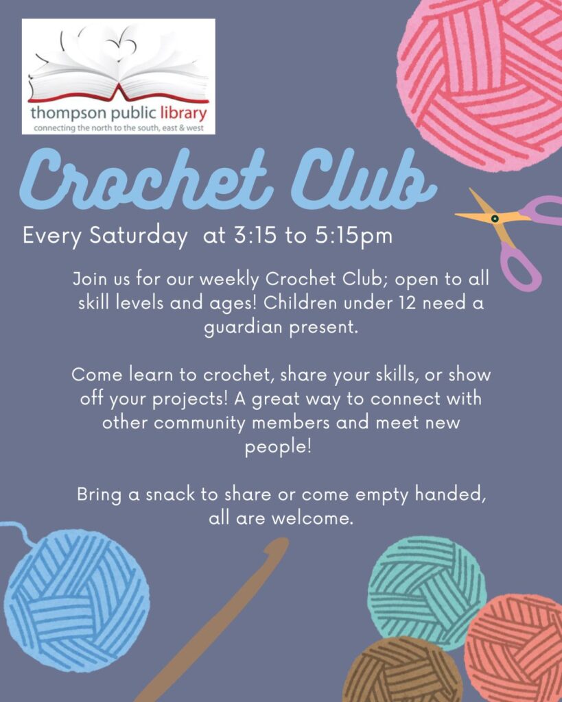 The library’s weekly Crochet Club continues every Saturday from 3:15 p.m. to 5:15 p.m. The group is open to all skill levels and welcomes anyone interested in crochet, knitting, drawing, or similar creative activities. Attendees can learn new skills or bring projects to share.