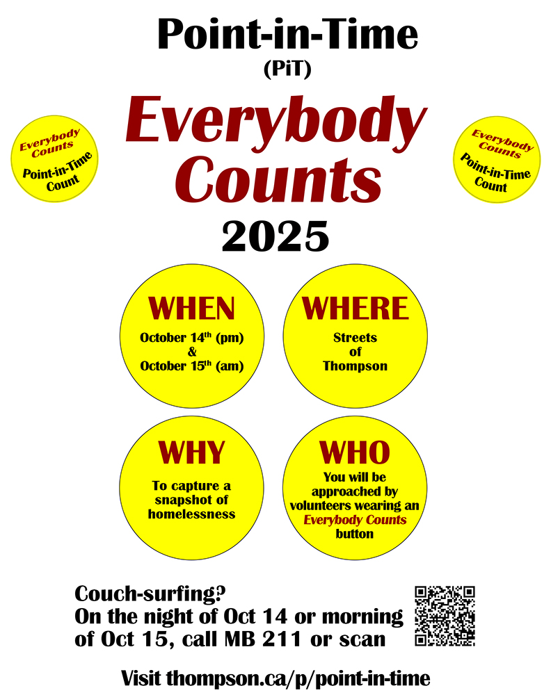 People without a permanent home who have internet access can also complete the survey online during the same period. Those who are couch-surfing are encouraged to participate by calling MB 211 or visiting thompson.ca/p/point-in-time.