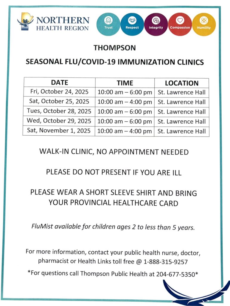 Northern Health Region has announced a series of walk-in flu and COVID-19 immunization clinics in Thompson. The clinics will run at St. Lawrence Hall on October 24, 25, 28, and 29, and again on November 1, 2025.